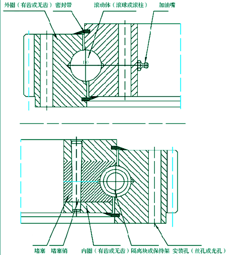 由左及右分別是(上部分): 1、外圈(有齒或無齒)2、密封帶 3、滾動體(滾球或滾柱) 4.加油嘴。